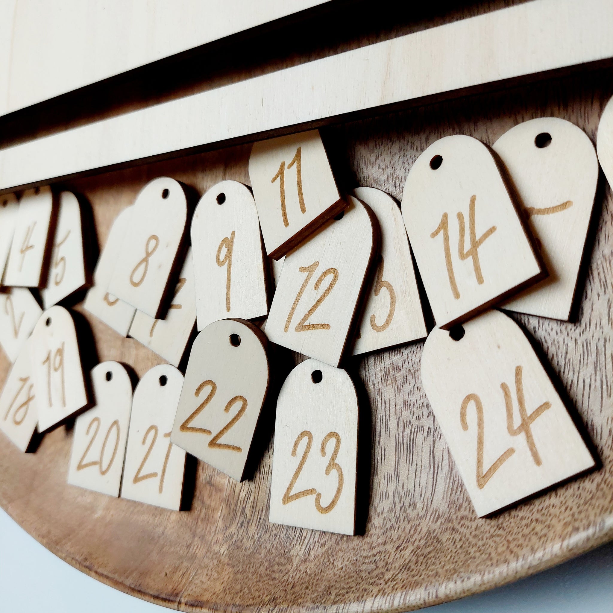Optional kannst du Adventskalenderzahlen dazubestellen - diese können an kleine Stoffbeutel gebunden werden (nicht im Lieferumfang enthalten).