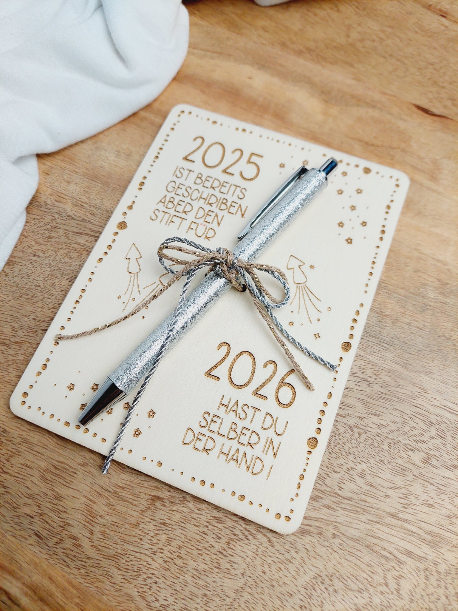 Der Text spricht für sich: 2025 ist bereits geschrieben, aber den Stift für 2026 hast du selber in der Hand! - Das ideale Mitbringsel oder Gastgeschenk für deine Silvester-Party.